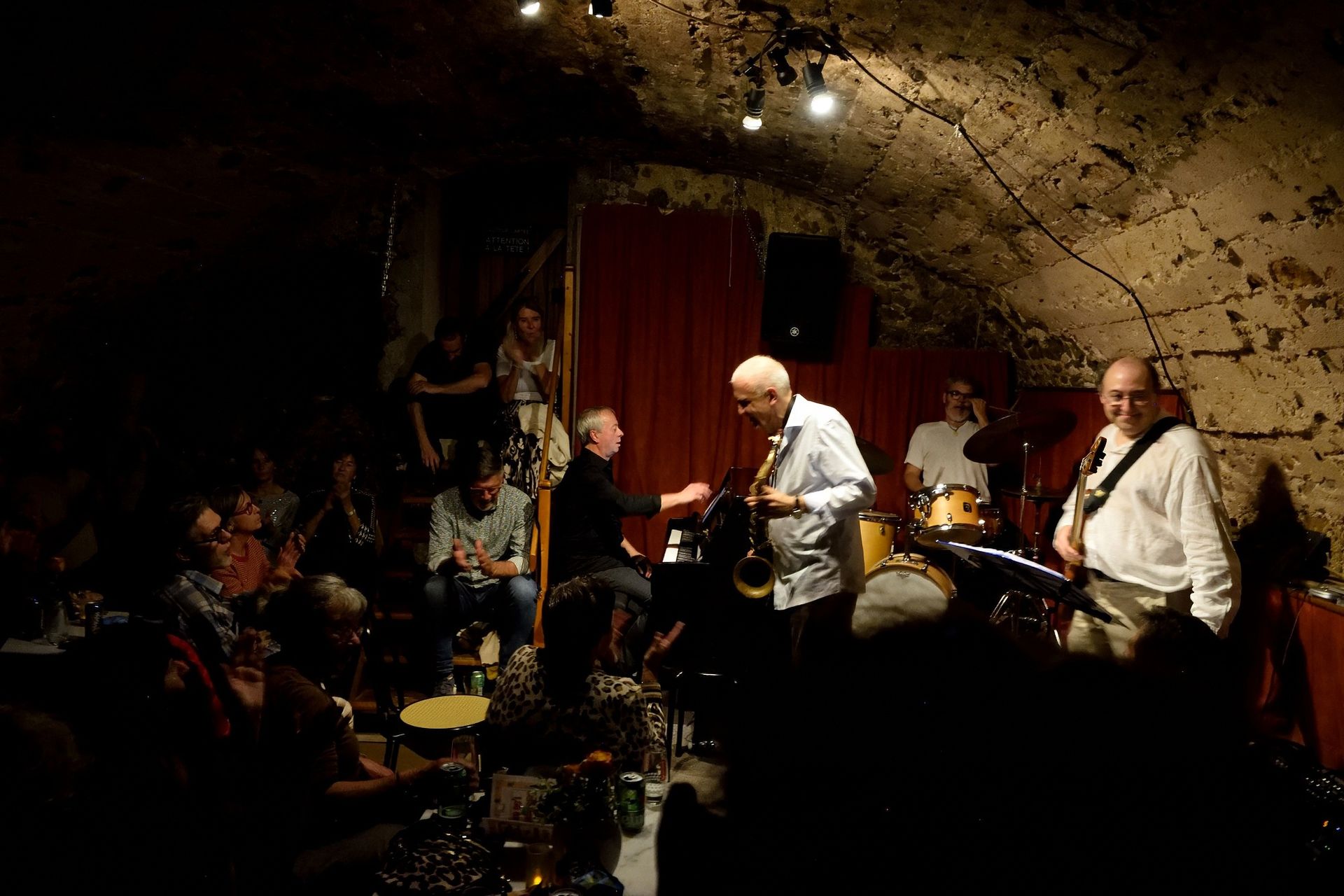 En première partie, la Compagnie So What était privée pour un soir de son saxophoniste Thomas Guillemaud. C'est donc en quartet que la Compagnie a commencé son set, vite renforcée par un autre saxophoniste, ami très cher et l'un des premiers musiciens à s'être produit dans les lieux, voici 28 ans : Franck Taschini. Le groupe s'en est donné à coeur joie !