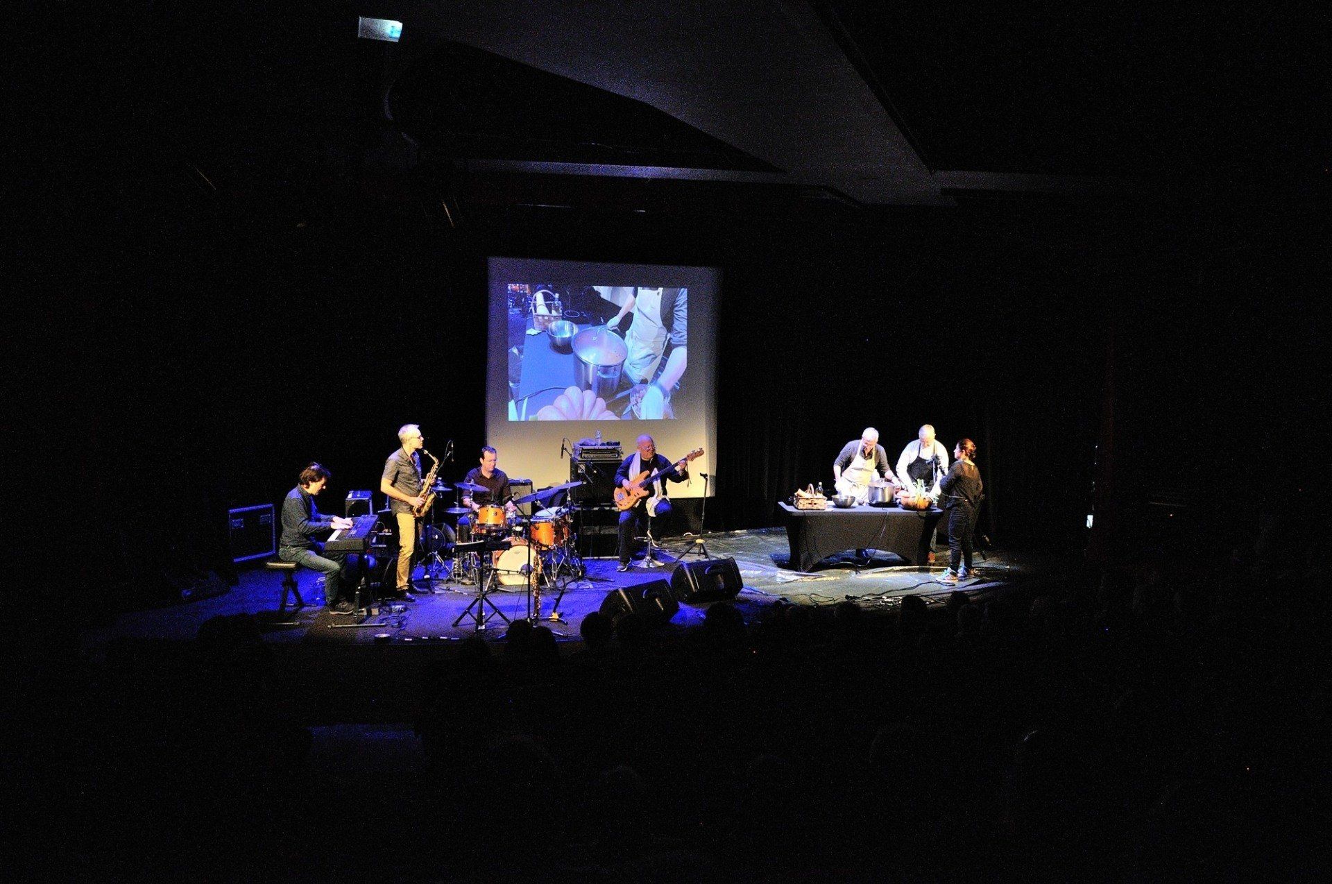 Guidé par les bénévoles, tout le monde se retrouvait ensuite dans la grande salle de la Coupole pour une séance mémorable "jazz pour les papilles". Imaginez plutôt : d'un côté de la scène, le quartet ChiC to ChicK qui improvisait sur le répertoire de Chic Corea et de l'autre côté de cette scène, deux cuisiniers de haut vol, Pierre Belleudy et Robert Larini, qui confectionnaient en direct une succulente soupe de courge aux pérugines. Une approche fusionnelle et des moments inoubliables, comme ce solo de batterie sur les casseroles des cuisiniers ou cette distribution à la becquée de pérugines par les cuisiniers aux musiciens en train de jouer... Et tout cela devant une salle comble et ravie, dans l'odeur succulente des ingrédients en train de mijoter, et sous la caméra de Virginie Tumorticchi... (photos ICI). La séance fut suivi par la remise par le maire de La Gaude des Trophées du Jazz de la Côte d'Azur, décernés cette année à la radio RCF-Côte d'Azur pour son action en faveur de la diffusion du jazz. Son président était aux anges, évidemment (photos ICI).