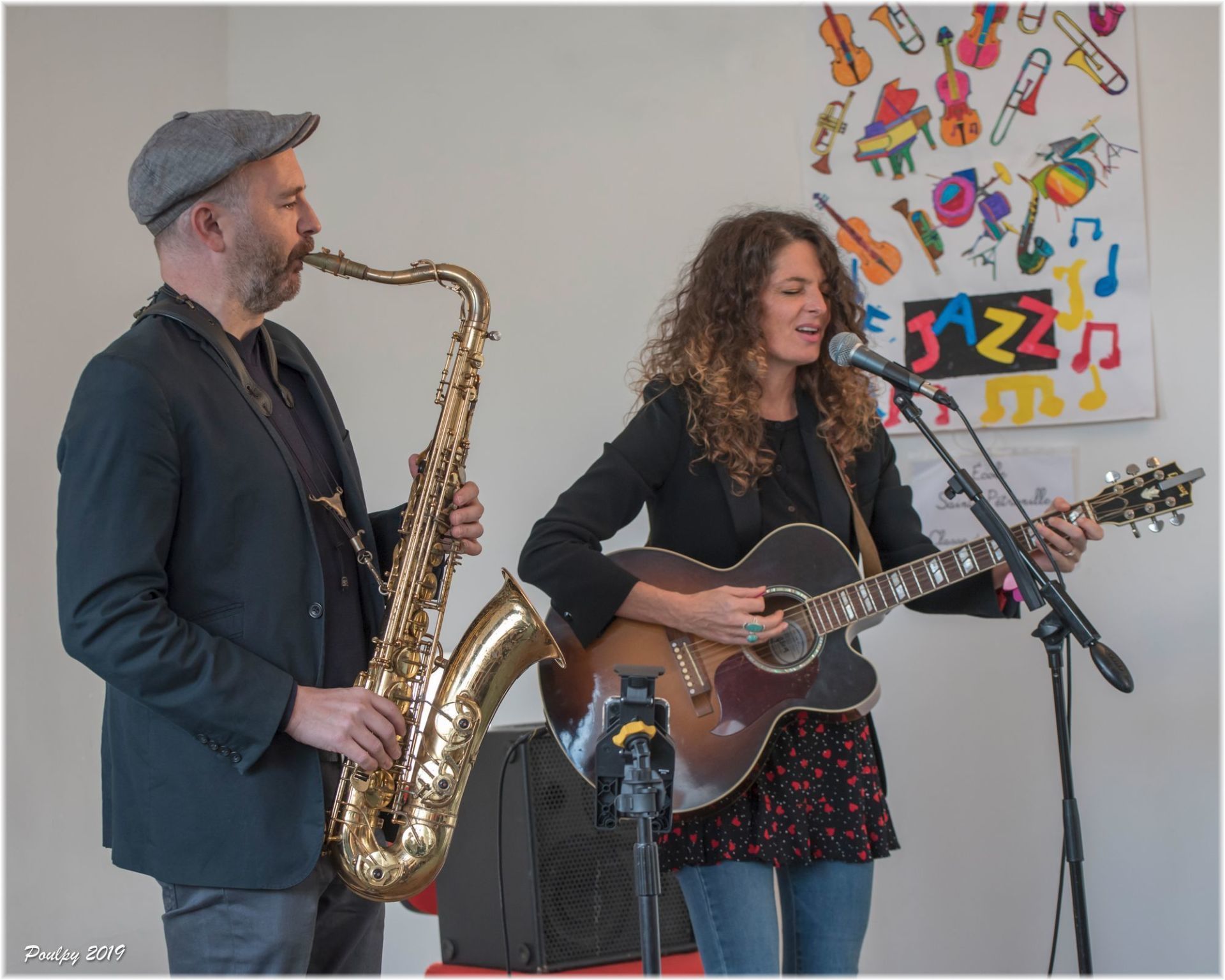Ensuite, retour au premier étage pour un nouveau café offert, puis au cabaret éphémère pour un nouveau concert par un duo talentueux, celui de la chanteuse-guitariste Marjorie Martinez et du saxophoniste Jay Metcalf, avec les textes dits par Michel Seyrat, devant un public toujours aussi nombreux et chaleureux (photos ICI).