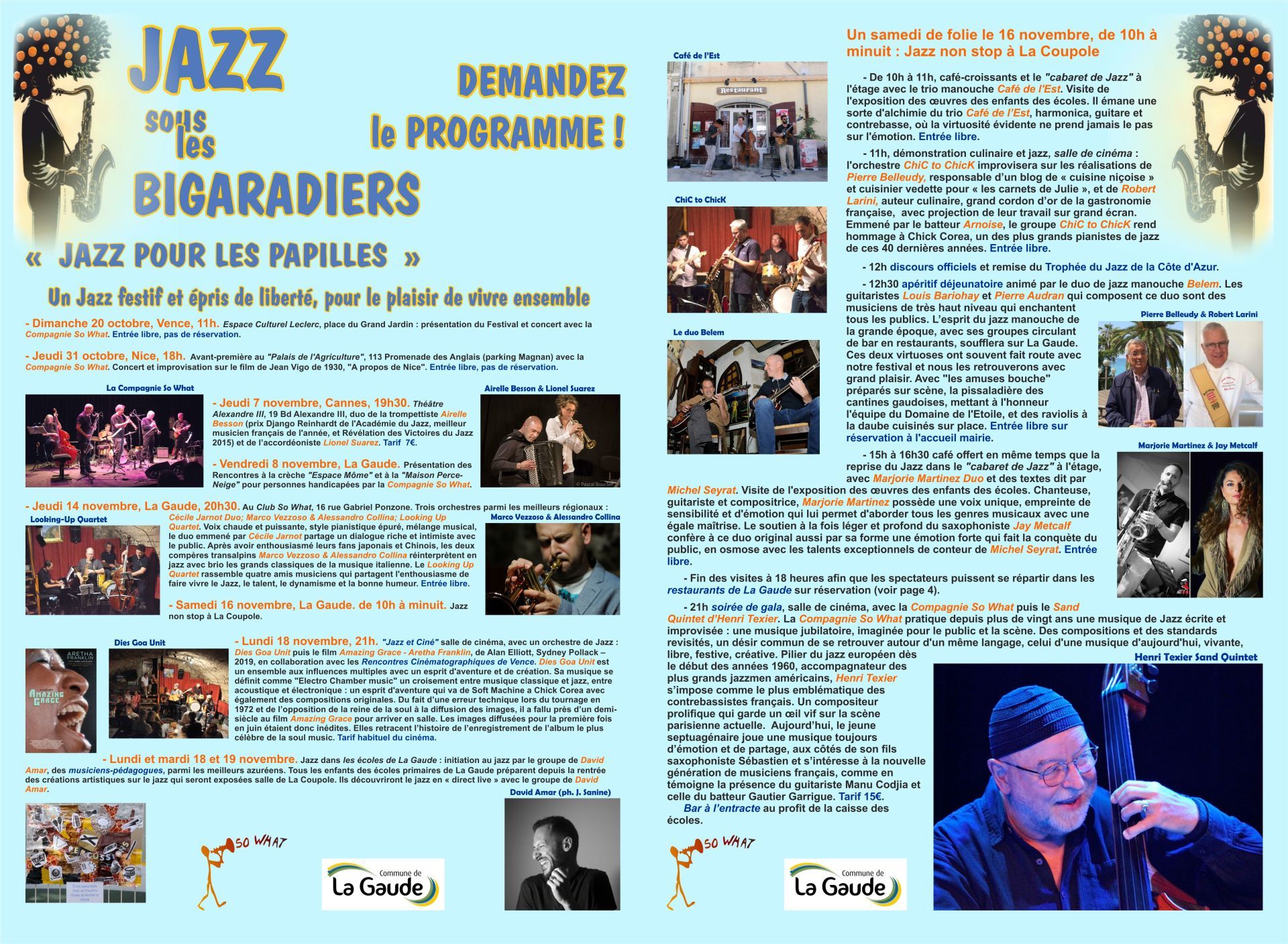 Un peu de gourmandise en prime le samedi 16 toute la journée avec même un apéro-buffet déjeunatoire précédé de cuisine sur scène pour mettre les oreilles et les papilles en fête. C’est cet idéal de vie que le Jazz sous les Bigaradiers vous a invité à partager, au-delà de toute mesure, avec en prime la remise des trophées du Jazz de la Côte d’Azur.