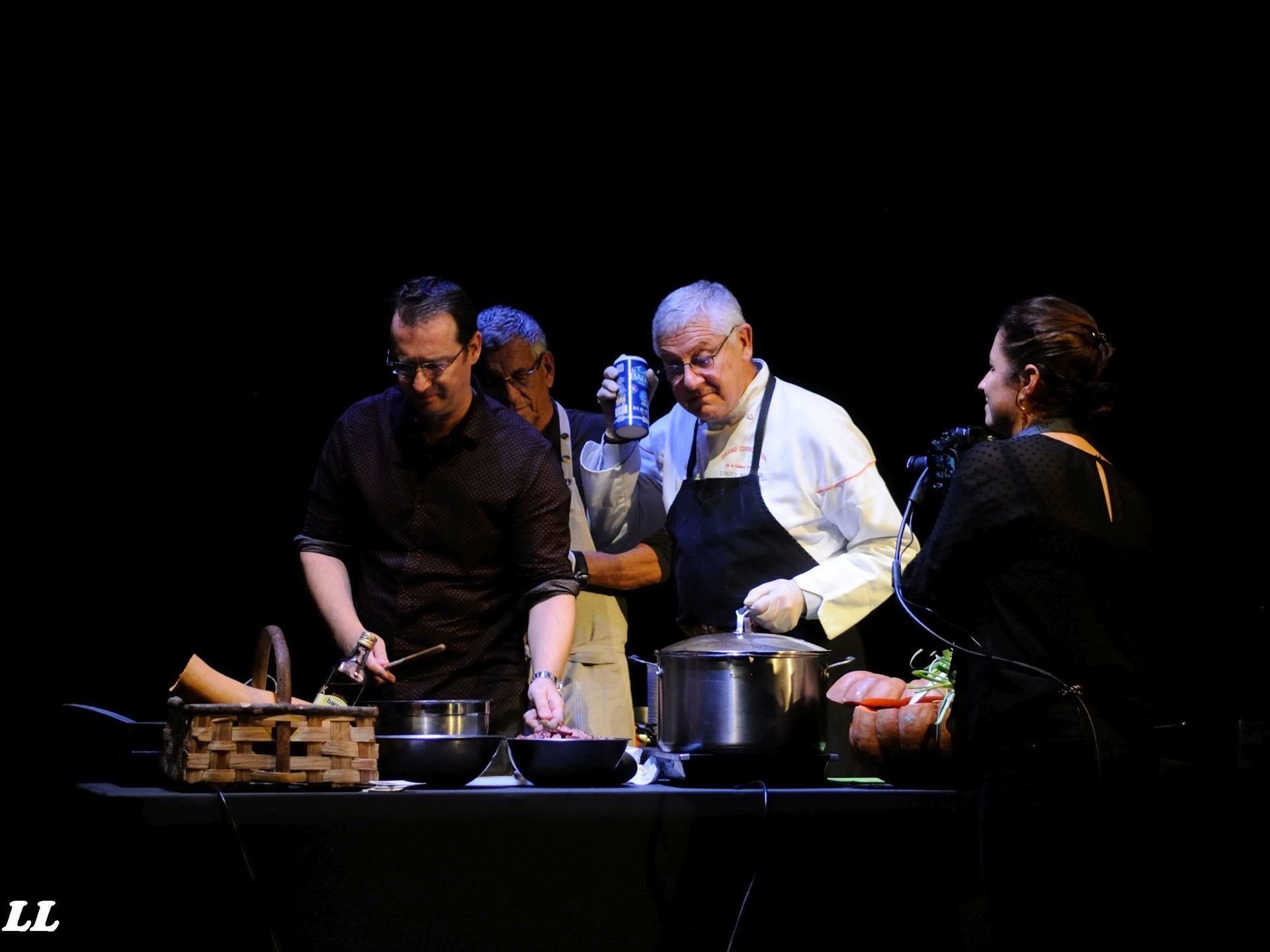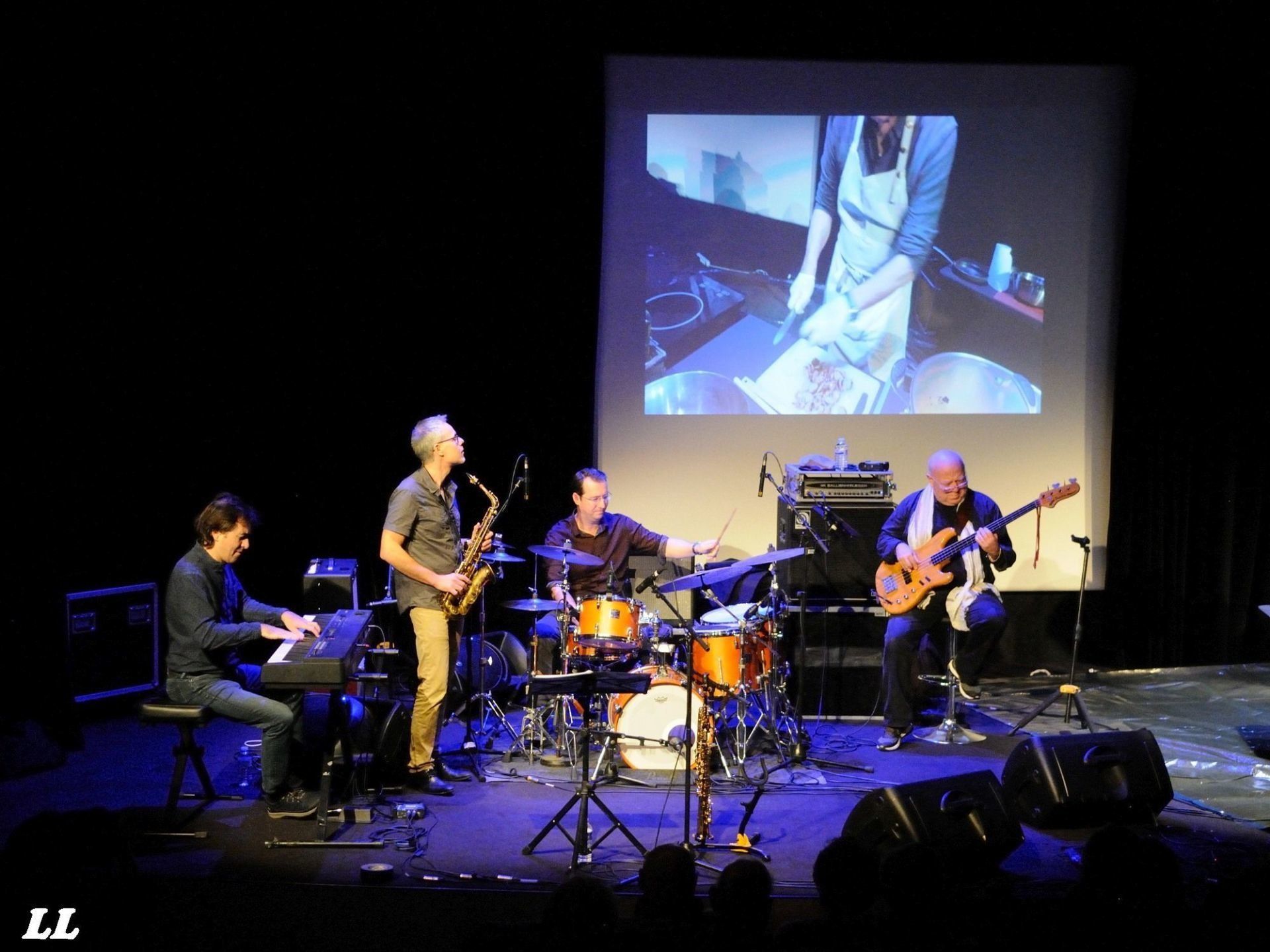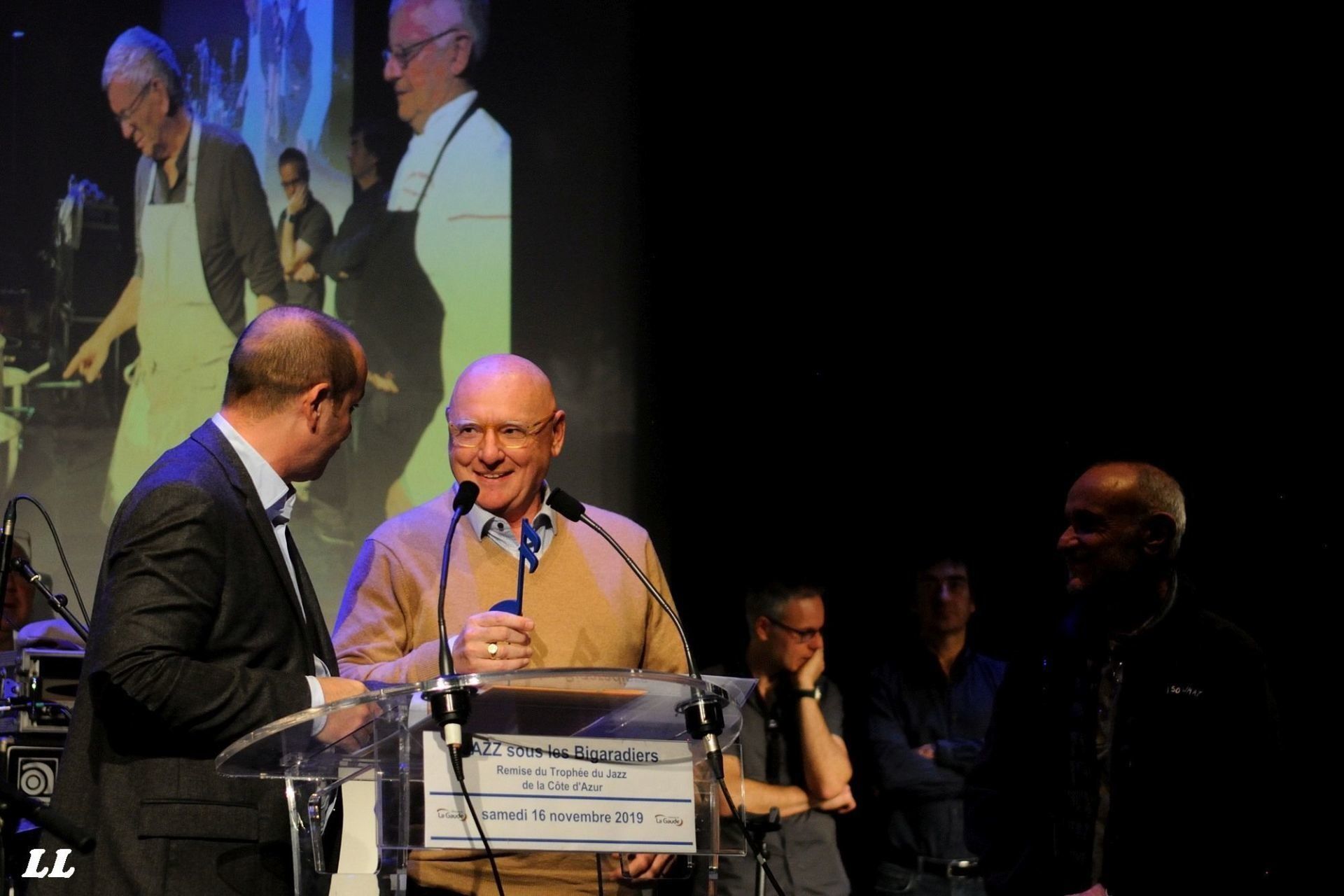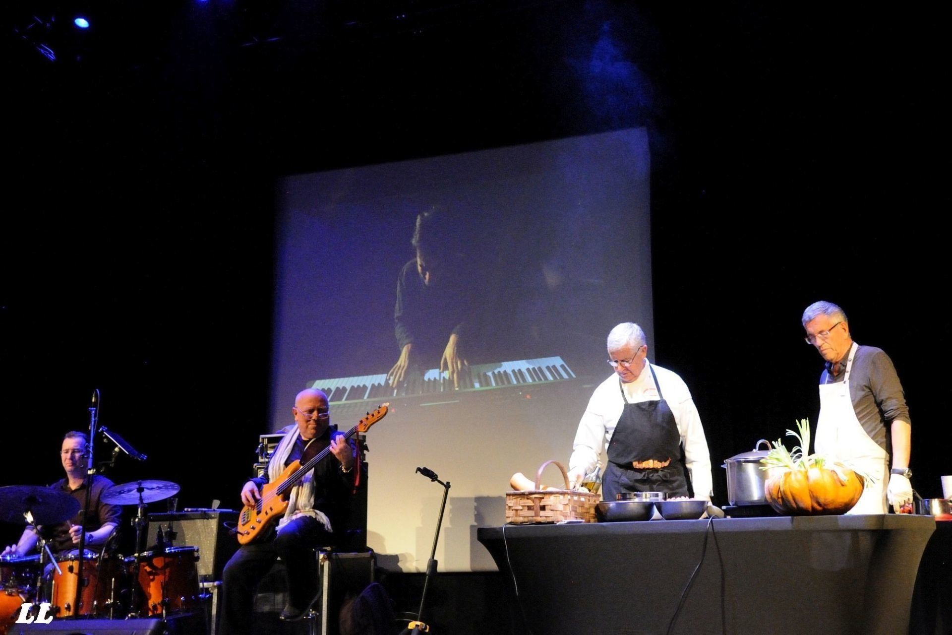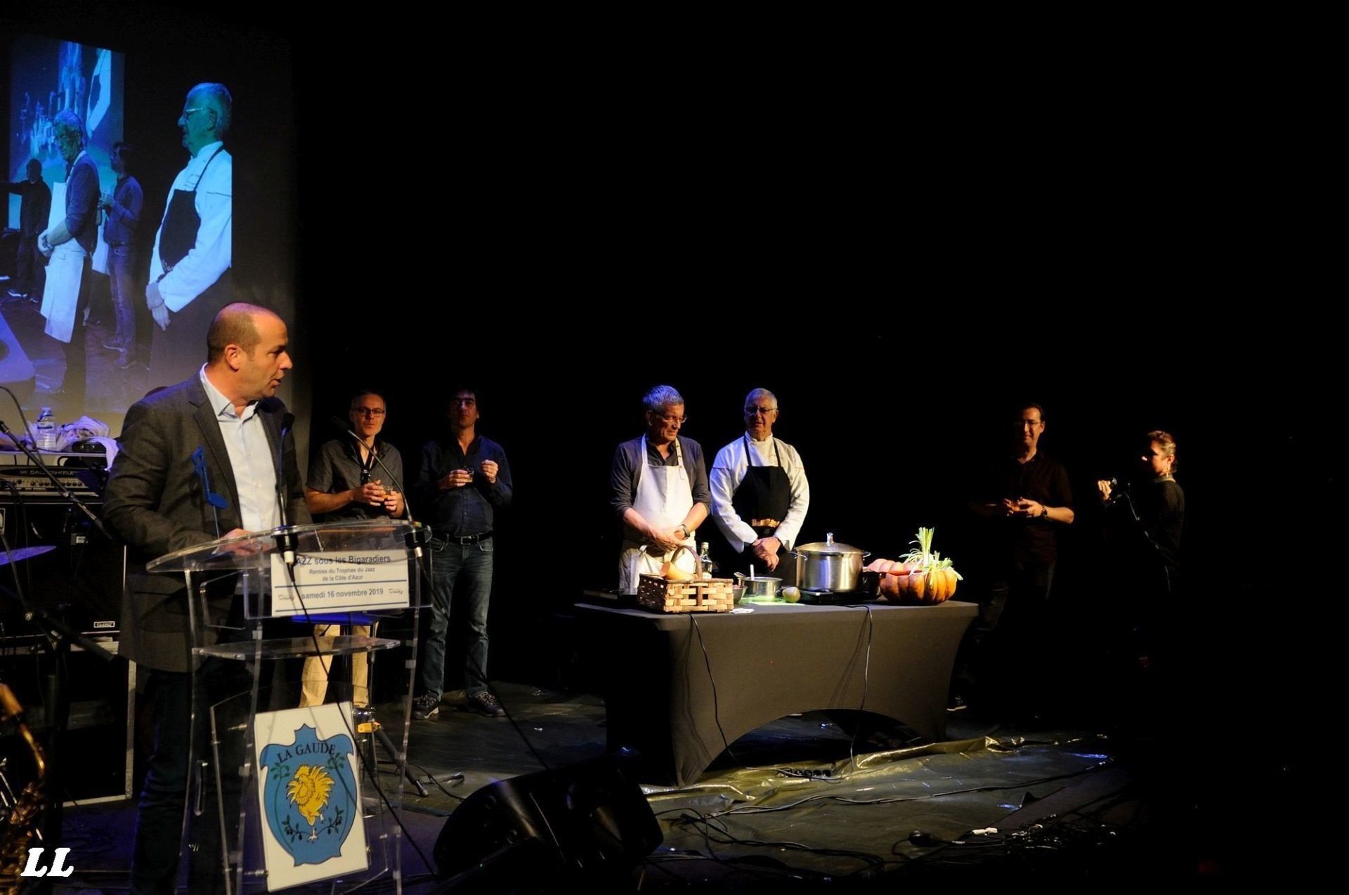 Guidé par les bénévoles, tout le monde se retrouvait ensuite dans la grande salle de la Coupole pour une séance mémorable "jazz pour les papilles". Imaginez plutôt : d'un côté de la scène, le quartet ChiC to ChicK qui improvisait sur le répertoire de Chic Corea et de l'autre côté de cette scène, deux cuisiniers de haut vol, Pierre Belleudy et Robert Larini, qui confectionnaient en direct une succulente soupe de courge aux pérugines. Une approche fusionnelle et des moments inoubliables, comme ce solo de batterie sur les casseroles des cuisiniers ou cette distribution à la becquée de pérugines par les cuisiniers aux musiciens en train de jouer... Et tout cela devant une salle comble et ravie, dans l'odeur succulente des ingrédients en train de mijoter, et sous la caméra de Virginie Tumorticchi... (photos ICI). La séance fut suivi par la remise par le maire de La Gaude des Trophées du Jazz de la Côte d'Azur, décernés cette année à la radio RCF-Côte d'Azur pour son action en faveur de la diffusion du jazz. Son président était aux anges, évidemment (photos ICI).