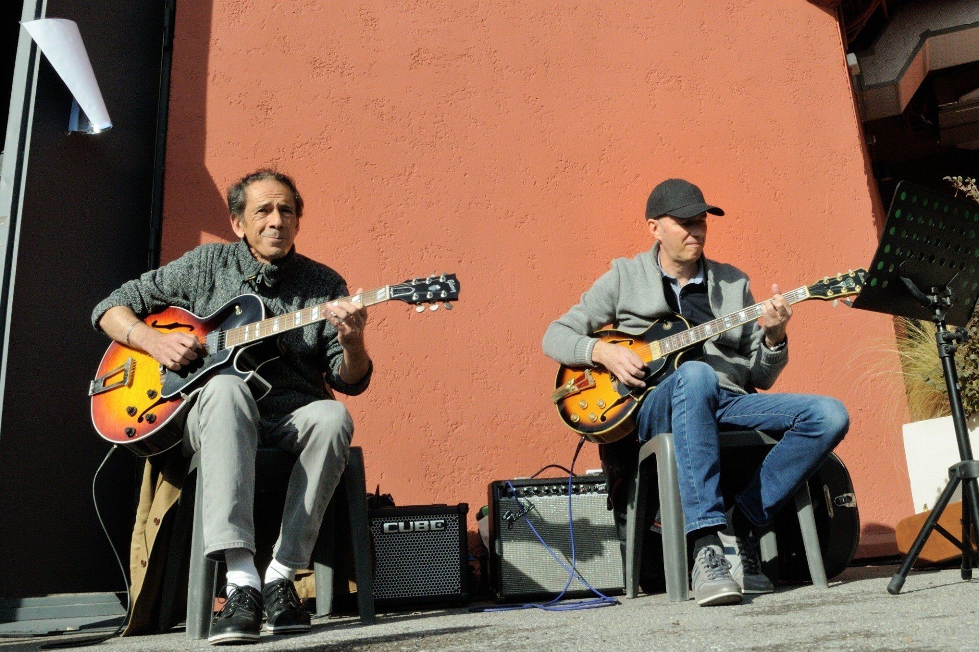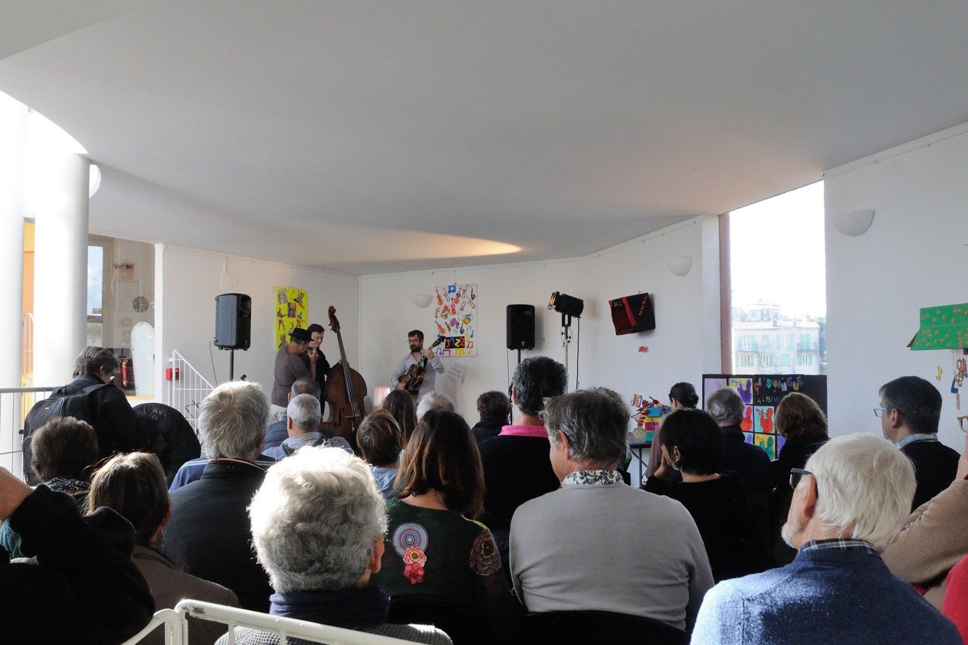 Tout avait commencé par un café-croissant offert dans la salle d'exposition de la Coupole, où l'on pouvait admirer les créations des élèves des écoles de La Gaude sur le thème de la boîte de jazz (photos ICI), suivi d'un concert dans le "cabaret éphémère" aménagé au premier étage, par le groupe Café de l'Est : standards chaleureux, harmonica, guitare, contrebasse... (photos ICI).