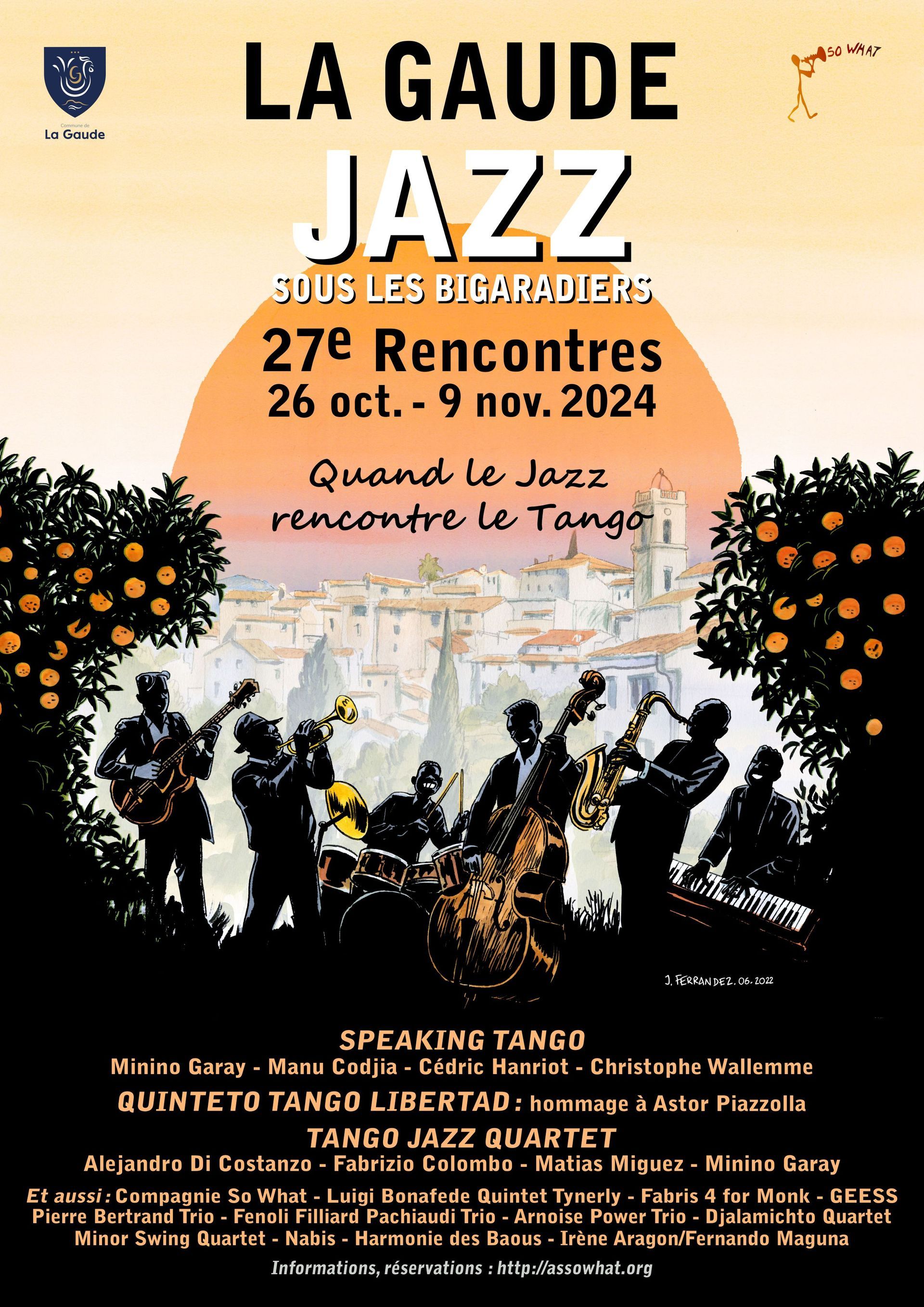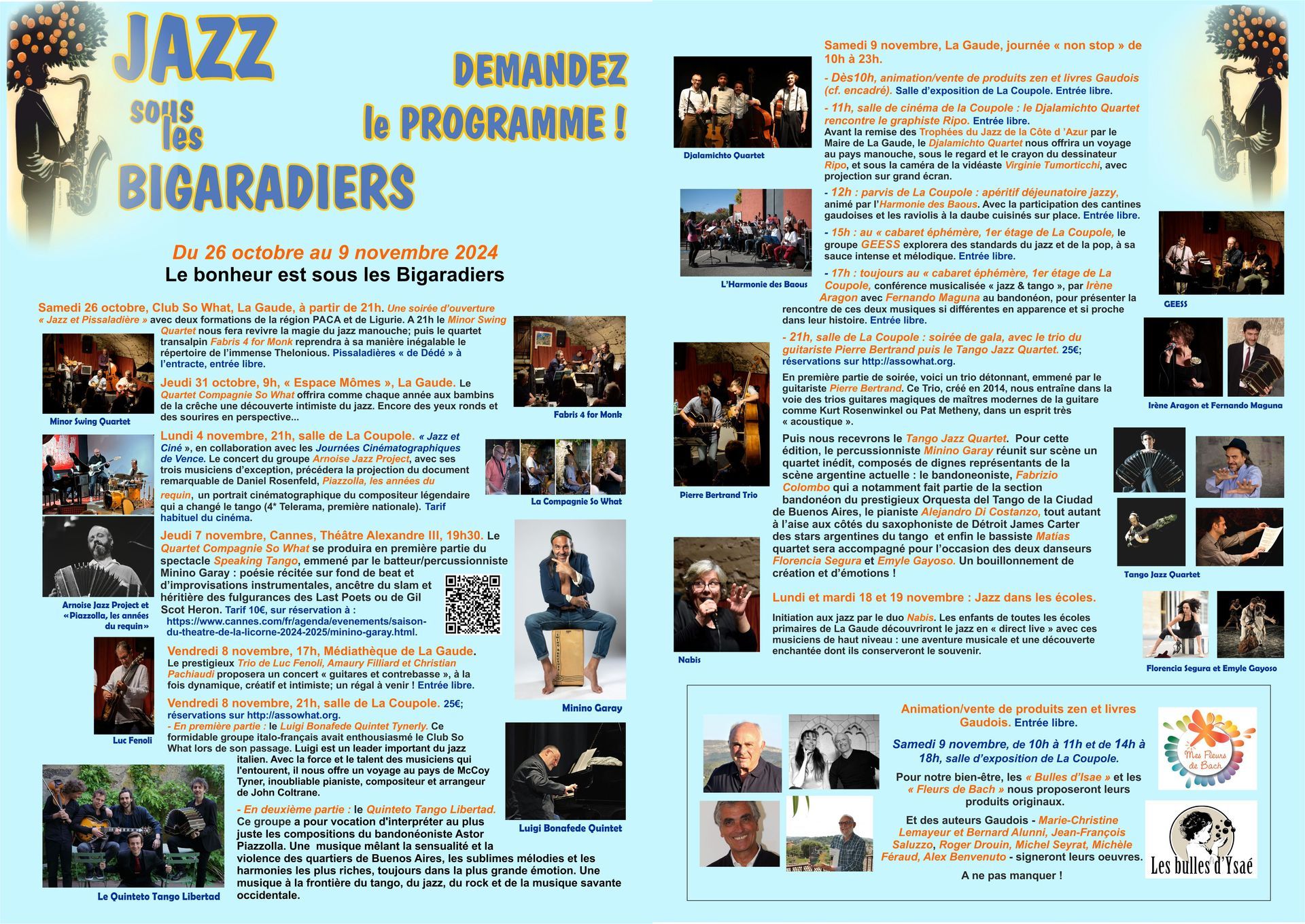 o samedi 9 novembre, journée « non stop » de 10h à minuit, à La Gaude, salle de la Coupole, les concerts du cabaret éphémère, conférence Jazz et Tango, animations/vente de produits zen et livres Gaudois, apéro Jazzy offert, remise des Trophées du jazz de la Côte d’Azur, performance artistique… et le TANGO JAZZ QUARTET en clôture.