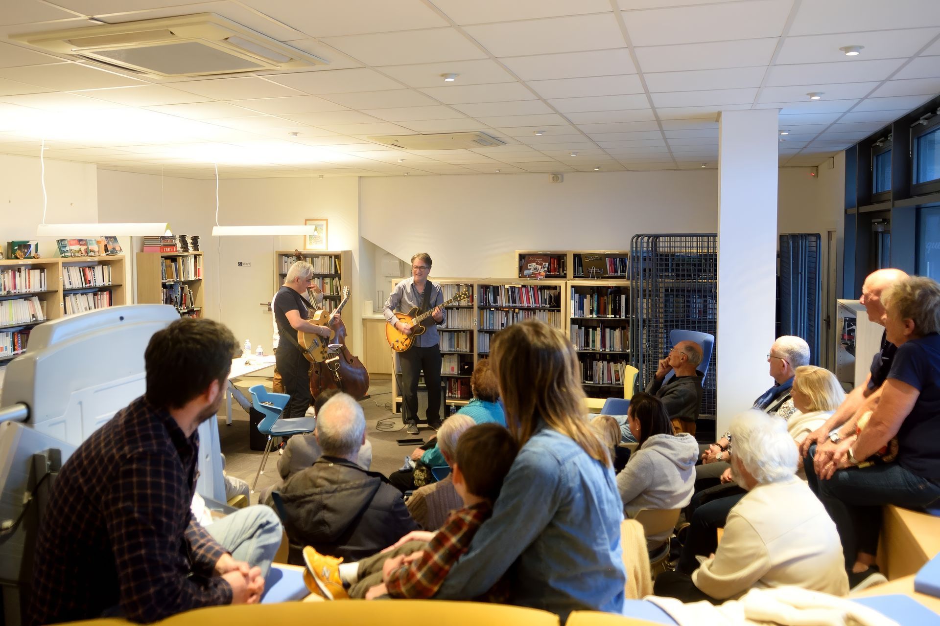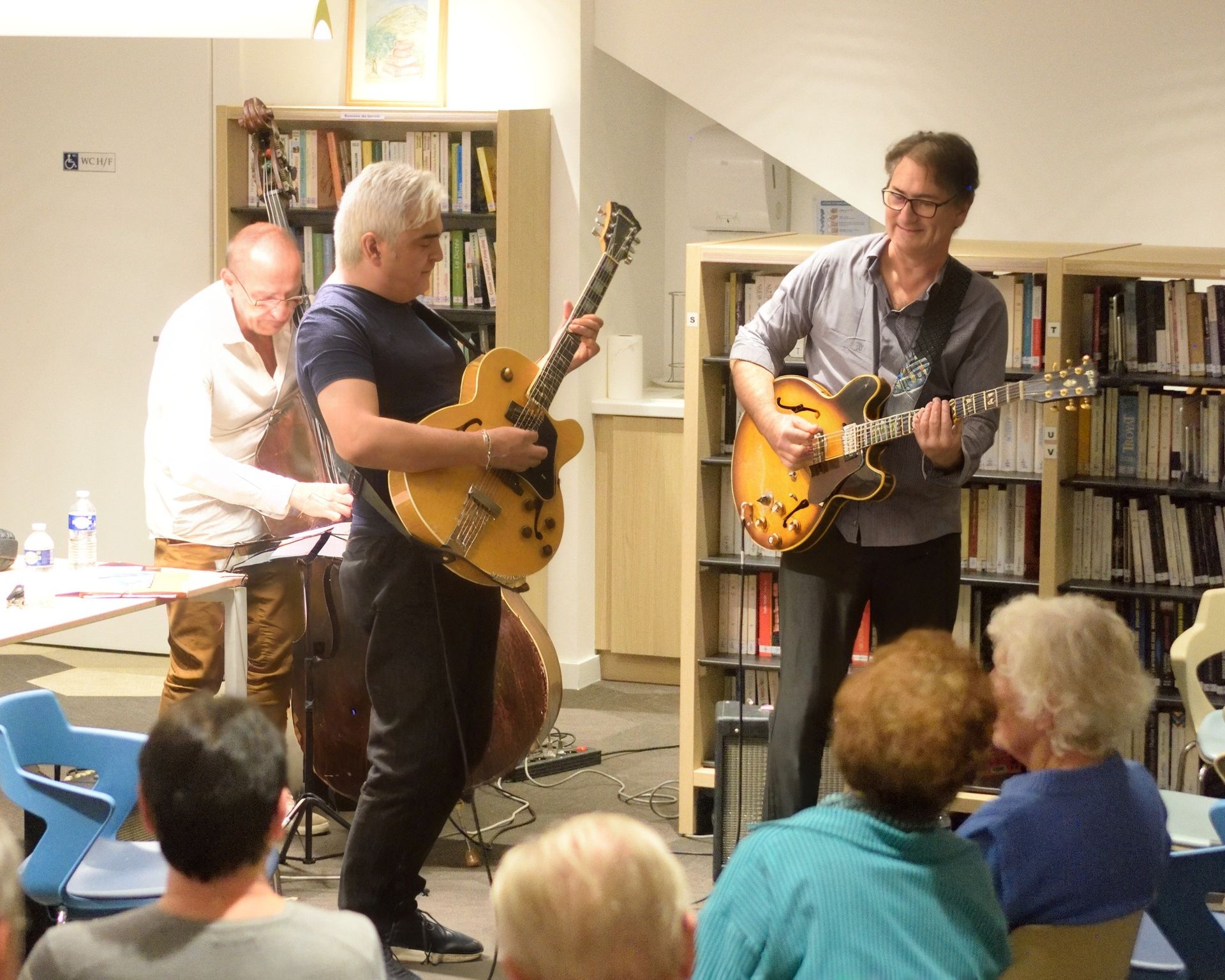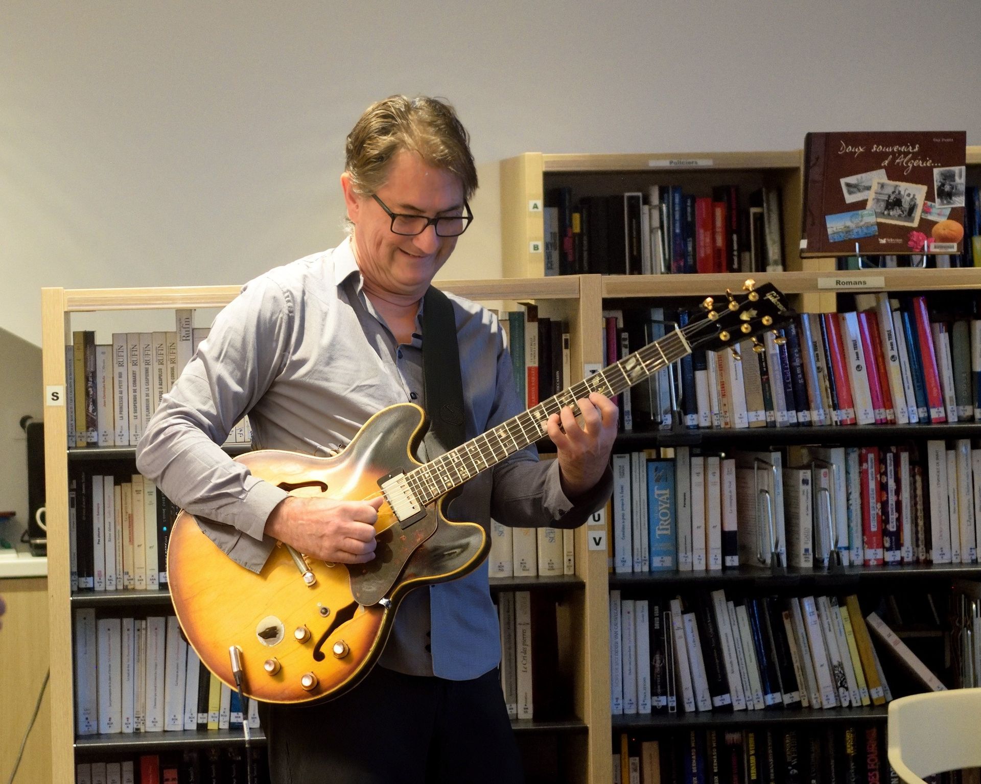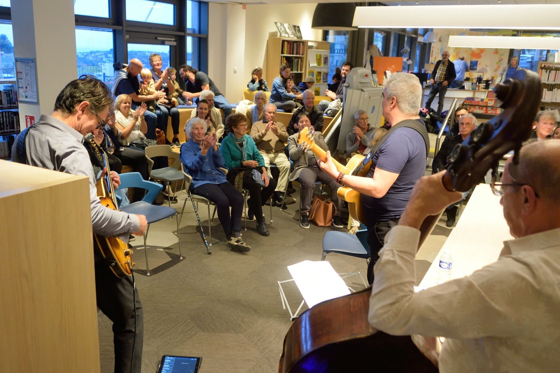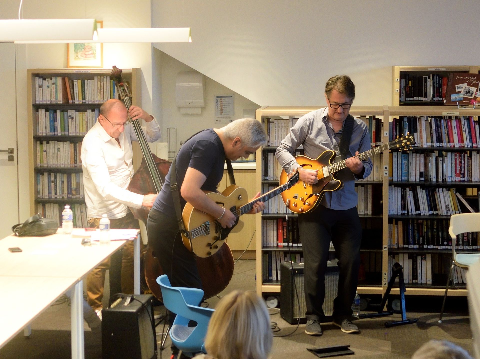 Le vendredi 8 novembre, le TRIO DE LUC FENOLI (Luc Fenoli, guitare; Amaury Filliard, guitare; Christian Pachiaudi, contrebasse) était à la Médiathèque de La Gaude, pour un concert chaleureux, dans une belle ambiance cabaret. Un moment savoureux, avec de super musiciens !