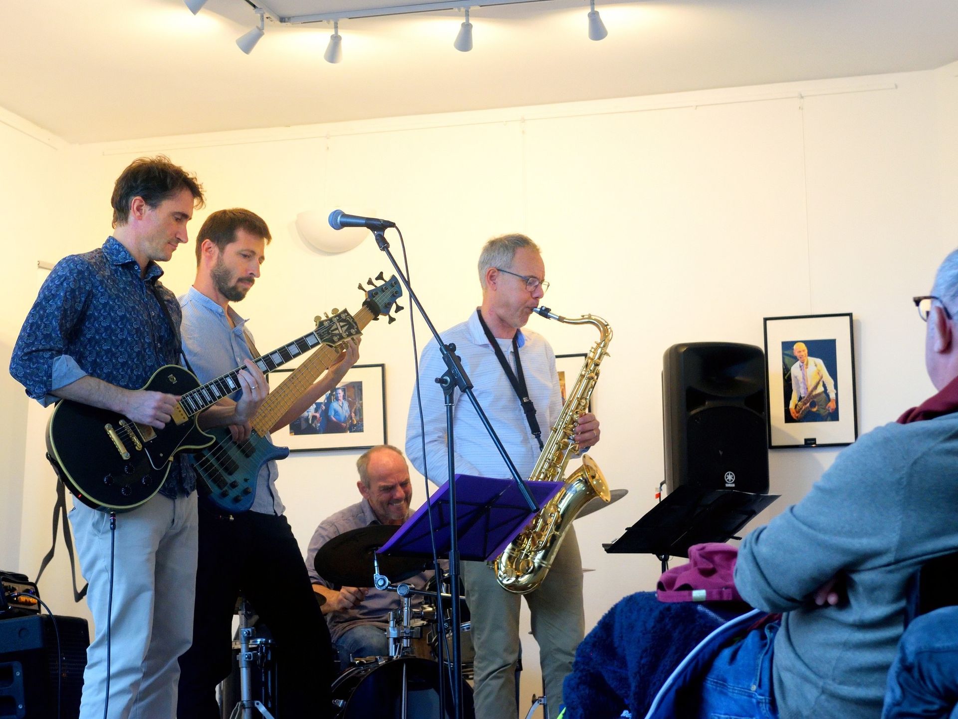 Dès 15h, le groupe GEESS était au "cabaret éphémère". C'est un lieu improbable, au premier étage de la Coupole, à La Gaude. Chaque année, pendant le festival Jazz sous les Bigaradiers, il prend vie, le temps de quelques concerts ou conférences. Un endroit resserré, avec un résonance de cathédrale... Et pourtant, il y avait presse, au milieu de cette "journée non-stop" du festival, pour applaudir la musique intense et mélodique du groupe GEESS (avec Jean-Jacques Gregis à la batterie, Dominique Bonarrigo au saxophone, Filippo Bondurri à la guitare, et Dominique Trefoloni à la basse) qui explore des standards de jazz et des morceaux pop chantés et jazzifiés, ou plutôt Geessifiés, en laissant une grande part à l'improvisation et à l'interaction entre musiciens.