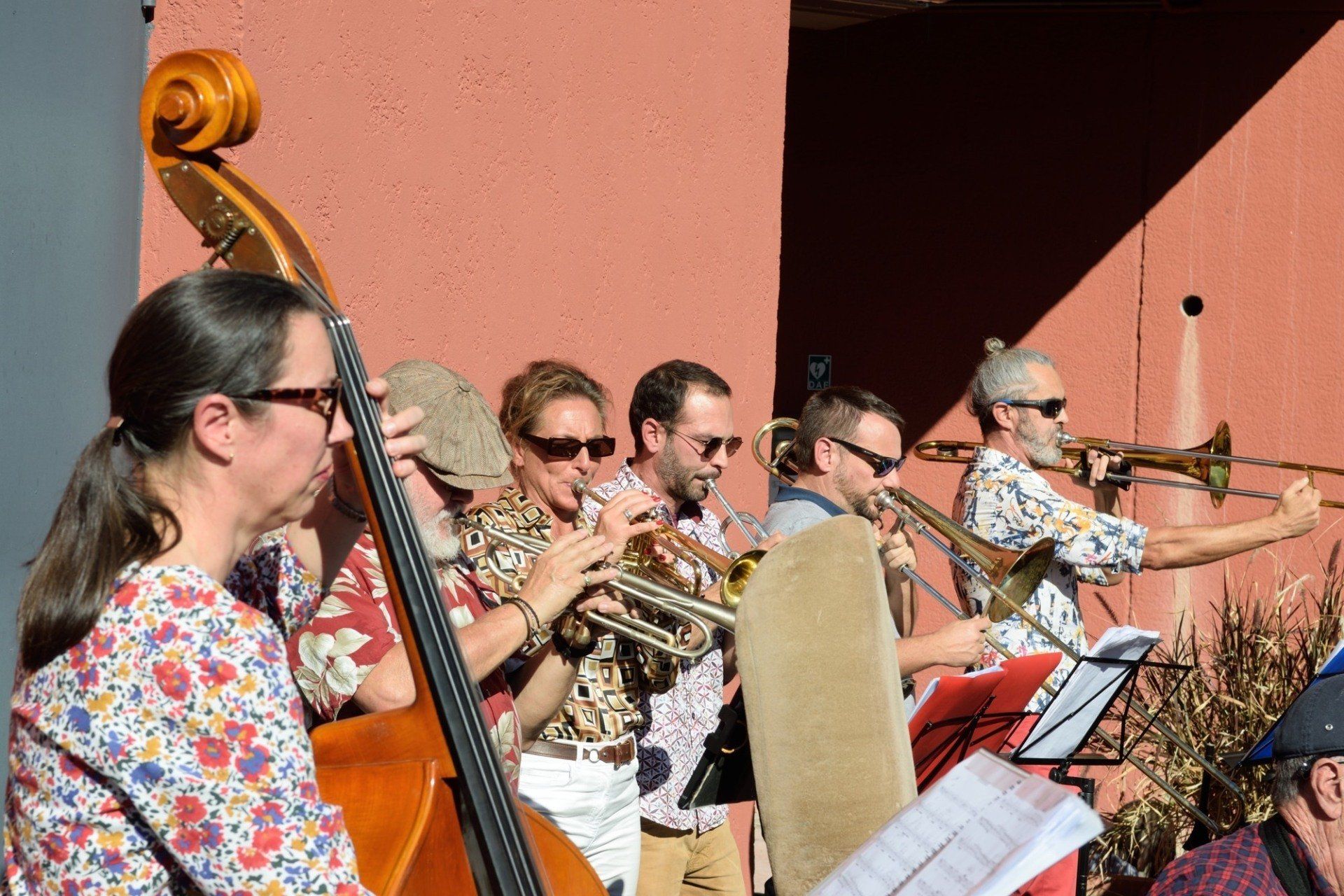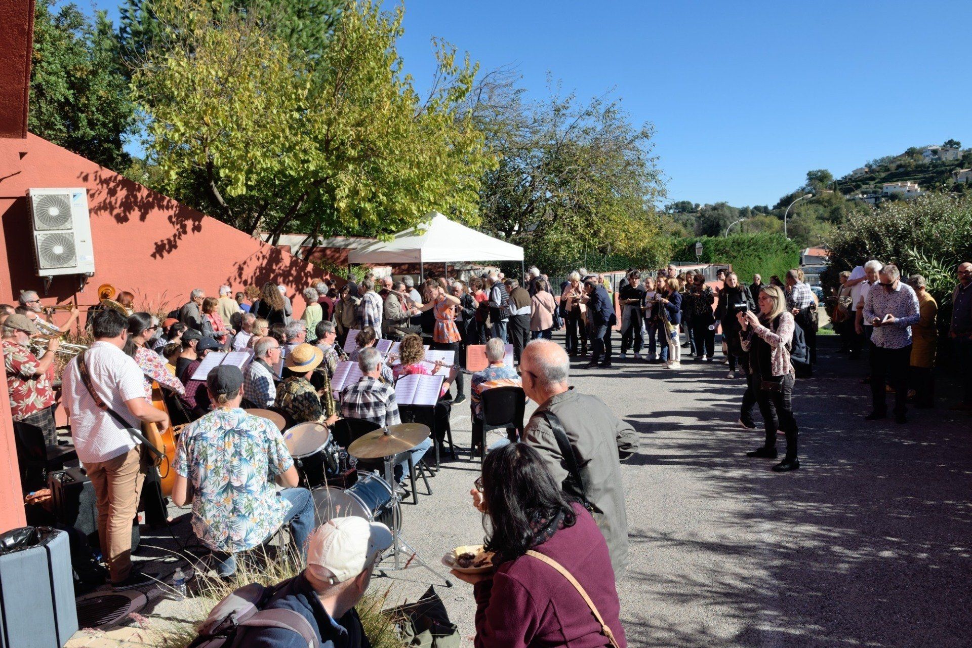 Après le concert de King of Blue et la remise des Trophées du Jazz de la Côte d'Azur, tout le monde s'est retrouvé au grand soleil de La Gaude, pour cet apéro-déjeunatoire offert à tous : raviolis à la daube, socca tout aussi succulente, pissaladières... Un régal pour les papilles. Et un régal pour les oreilles, avec l'HARMONIE DE LA GAUDE : sous la direction et avec les arrangements de Géraldine Karpp, ce groupe festif nous à réjouis tout autant !