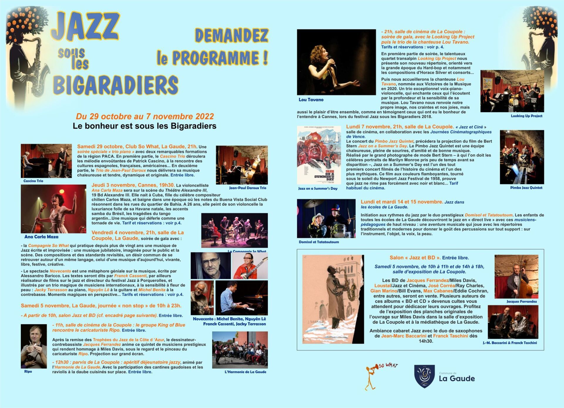 la remise du Trophée du Jazz de la Côte d’Azur, un apéro-déjeunatoire jazzy, une journée Jazz et BD, une soirée Jazz et Cinéma et une initiation au Jazz dans toutes les écoles de La Gaude...