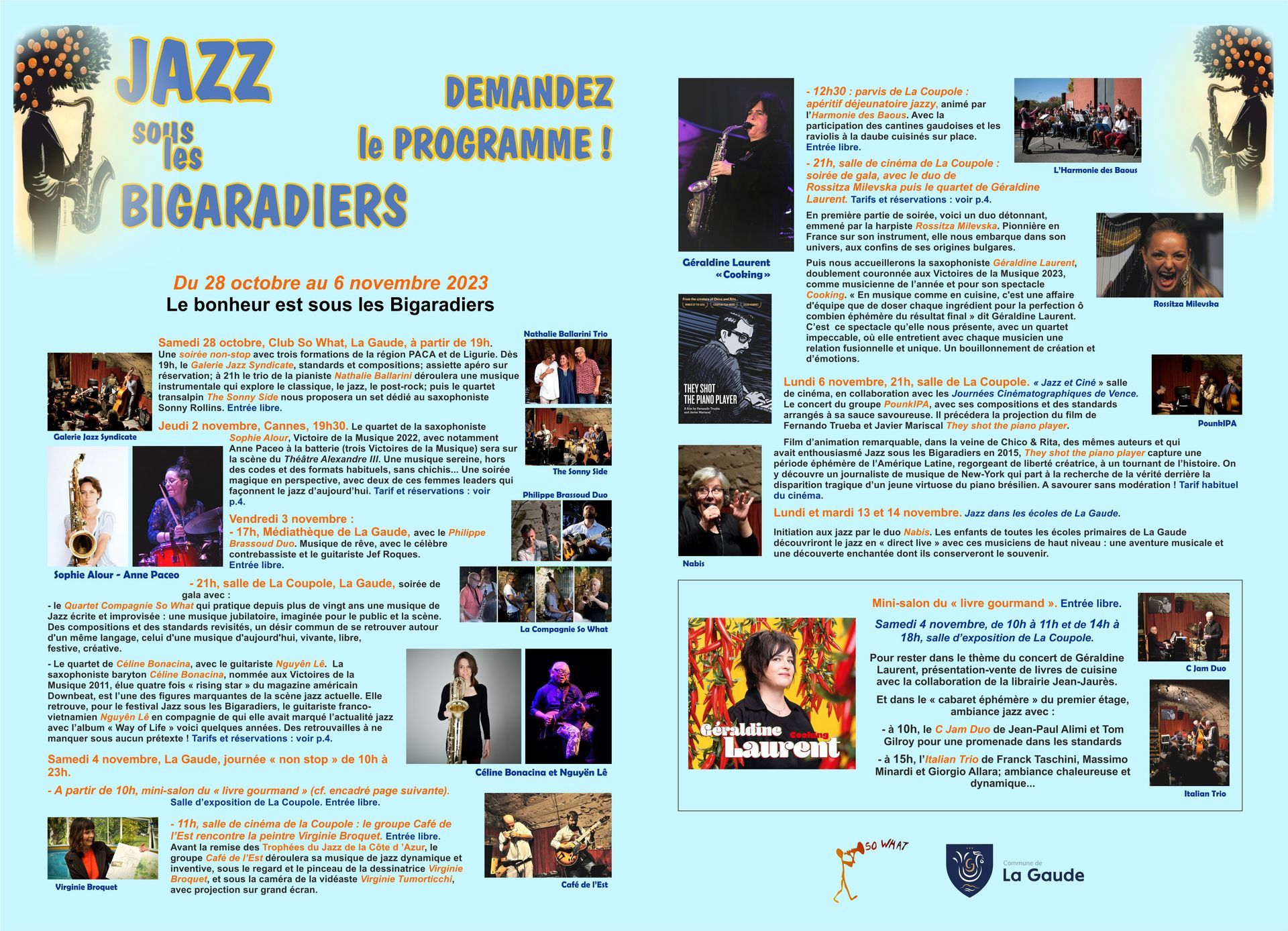 Rositza Milevska duo, Nathalie Ballarini trio, PoukIPA quartet, Nabis, l’Harmonie des Baous, Compagnie So What, Galerie Jazz Syndicate, Philippe Brassoud Duo, Italian Trio, The Sonny Side, C Jam Duo, Café de l’Est