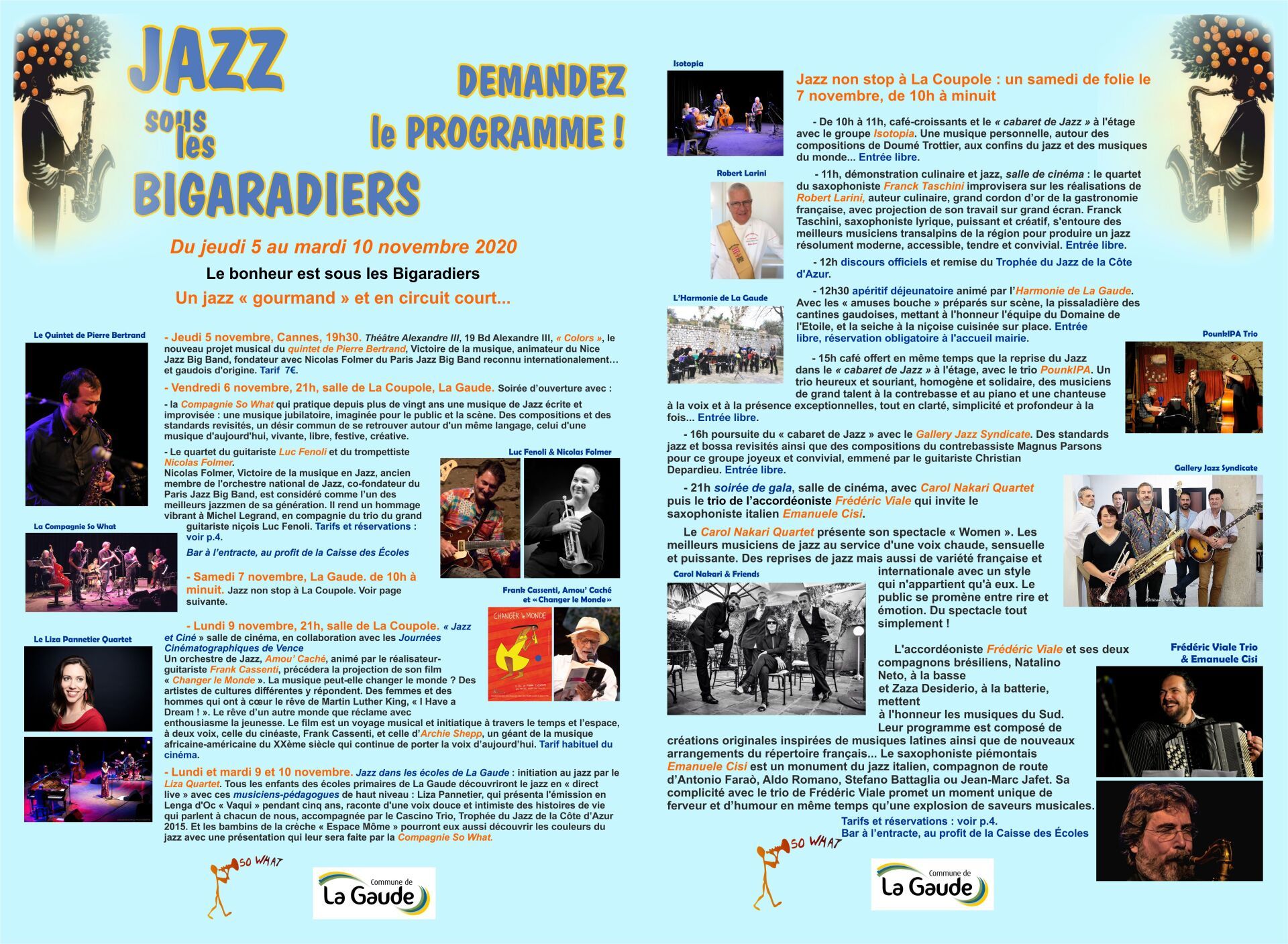 - La soirée jazz et cinéma du lundi 9 novembre, organisée avec les Journées Cinématographiques de Vence, avec le groupe Amou' Caché de Franck Cassenti et la projection de son film "Changer le Monde" est maintenue mais avancée à 17h30.