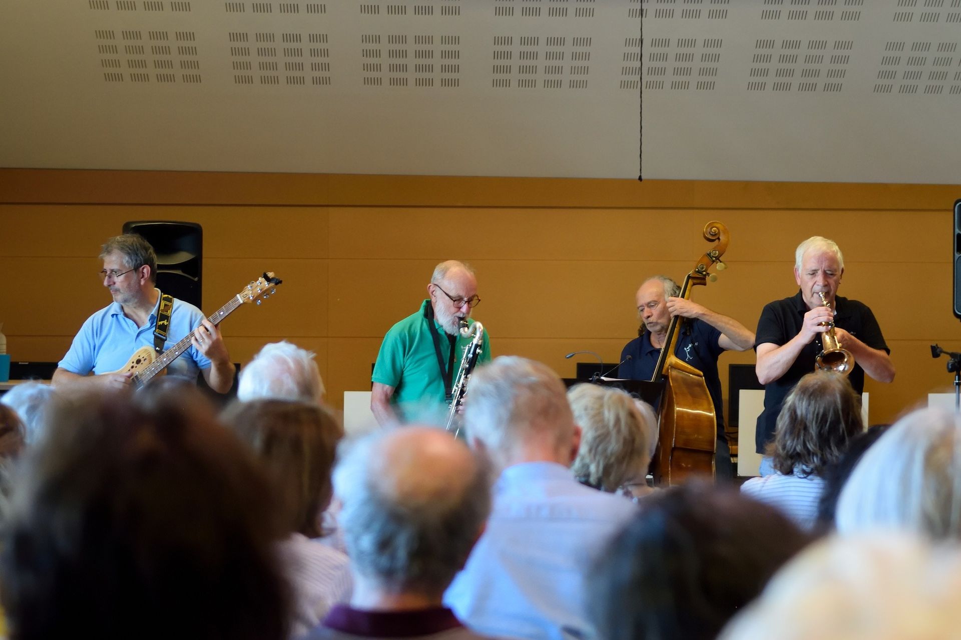Le quartet de la Compagnie So What (Alex BENVENUTO : Clarinette Basse; Laurent LAPCHIN : bugle, trompette; Jean-Marc LAUGIER : Contrebasse; José SERAFINO : guitare) se produisait dans son village de Coursegoules, devant la médiathèque. L'endroit est magique; le village ne l'est pas moins. C'est ici que trois adolescents ont fait leurs premiers pas musicaux en... 1963 ! 60 ans plus tard, ils y étaient en concert, en compagnie du "jeunot", José Serafino. L'herbe est confortable mais tout de même, chacun avait apporté son siège !